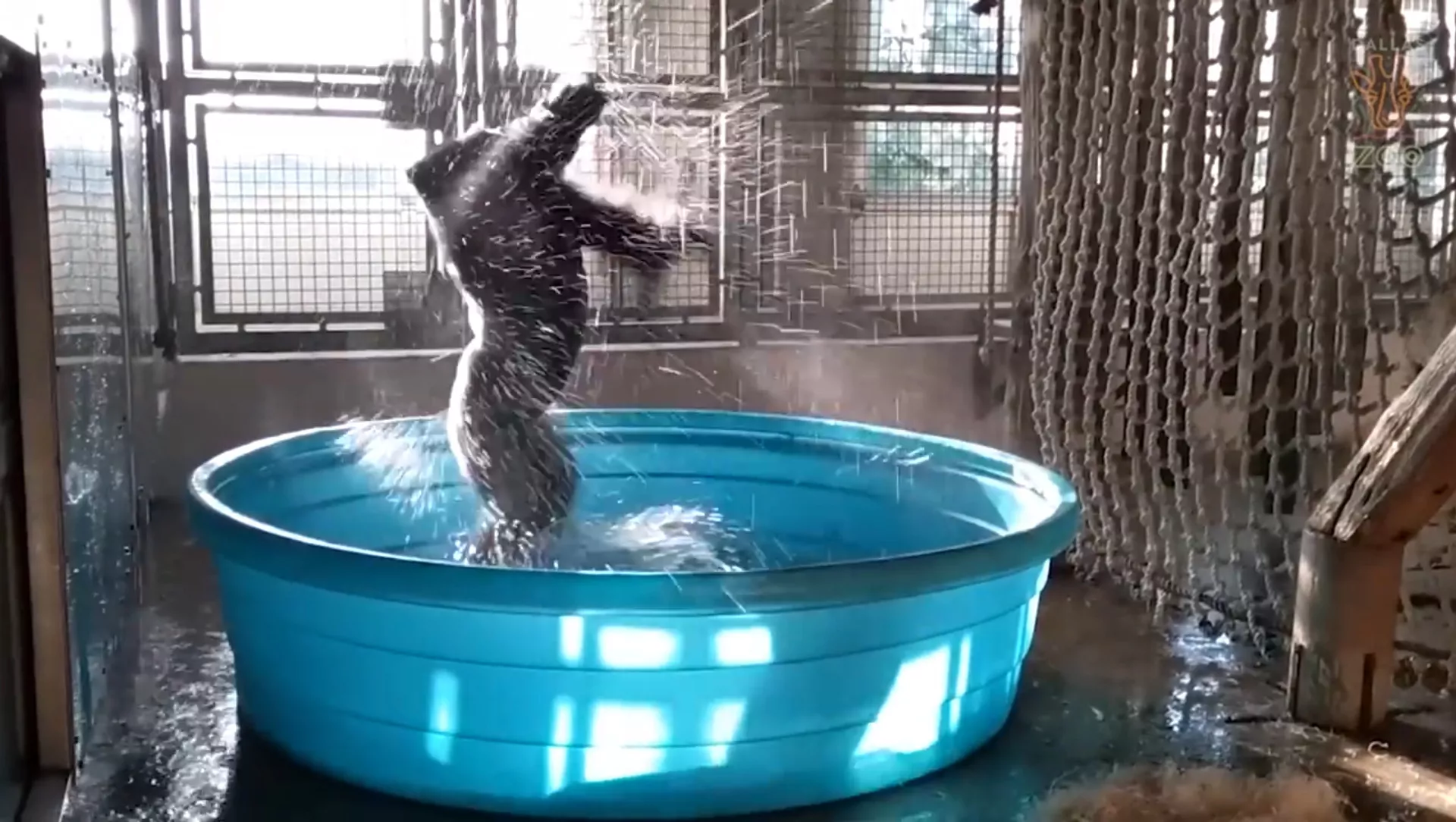 Администрация заведения опубликовала видеоролик, в котором самец гориллы по кличке Золя сначала спокойно плещется в бассейне, а затем неожиданно начинает исполнять танец, отдаленно напоминающий брейк-данс.