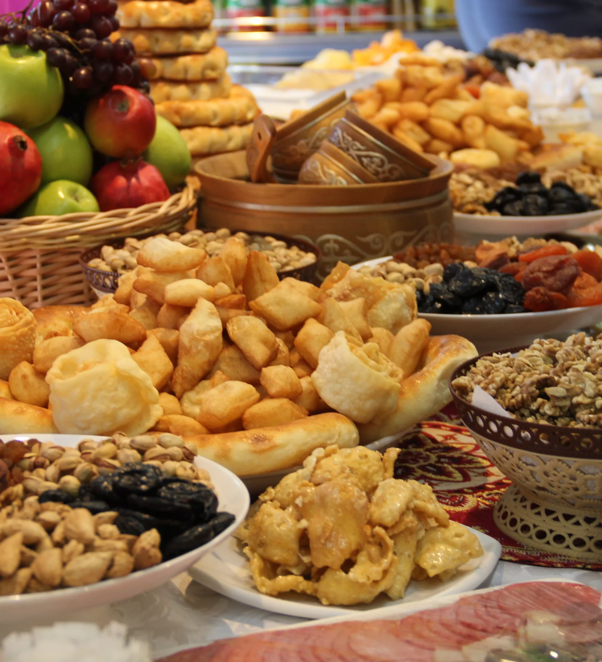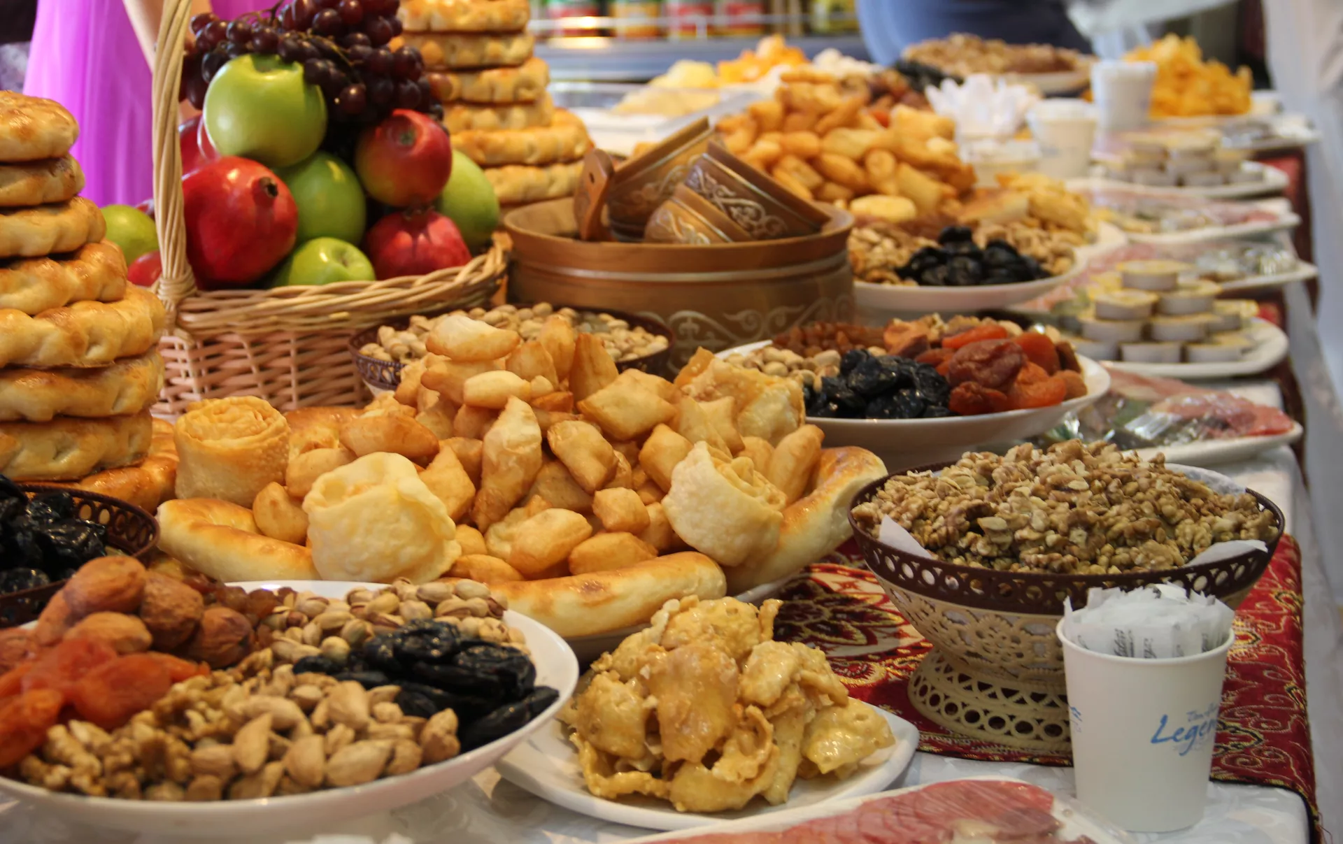 На скатерти расставлены блюда с сухофруктами, колбасой и курутом. Рядами выстроены бутылки с максымом — москвичам объясняют, что это квас из толокна и минералки. На отдельном столике стоят коньяк и вино.