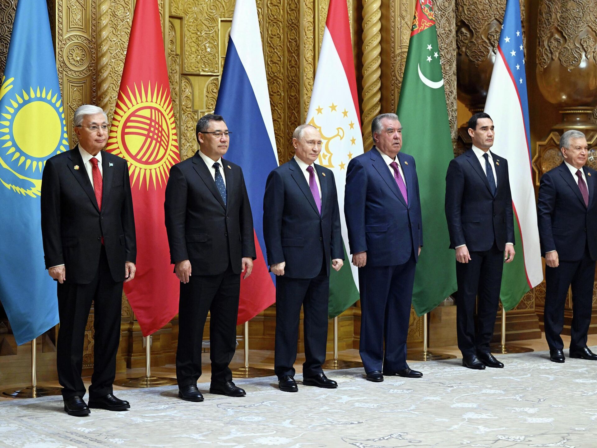 Состоялось совместное фотографирование лидеров стран Центральной Азии и России, после чего главы делегаций перешли в зал для участия в саммите