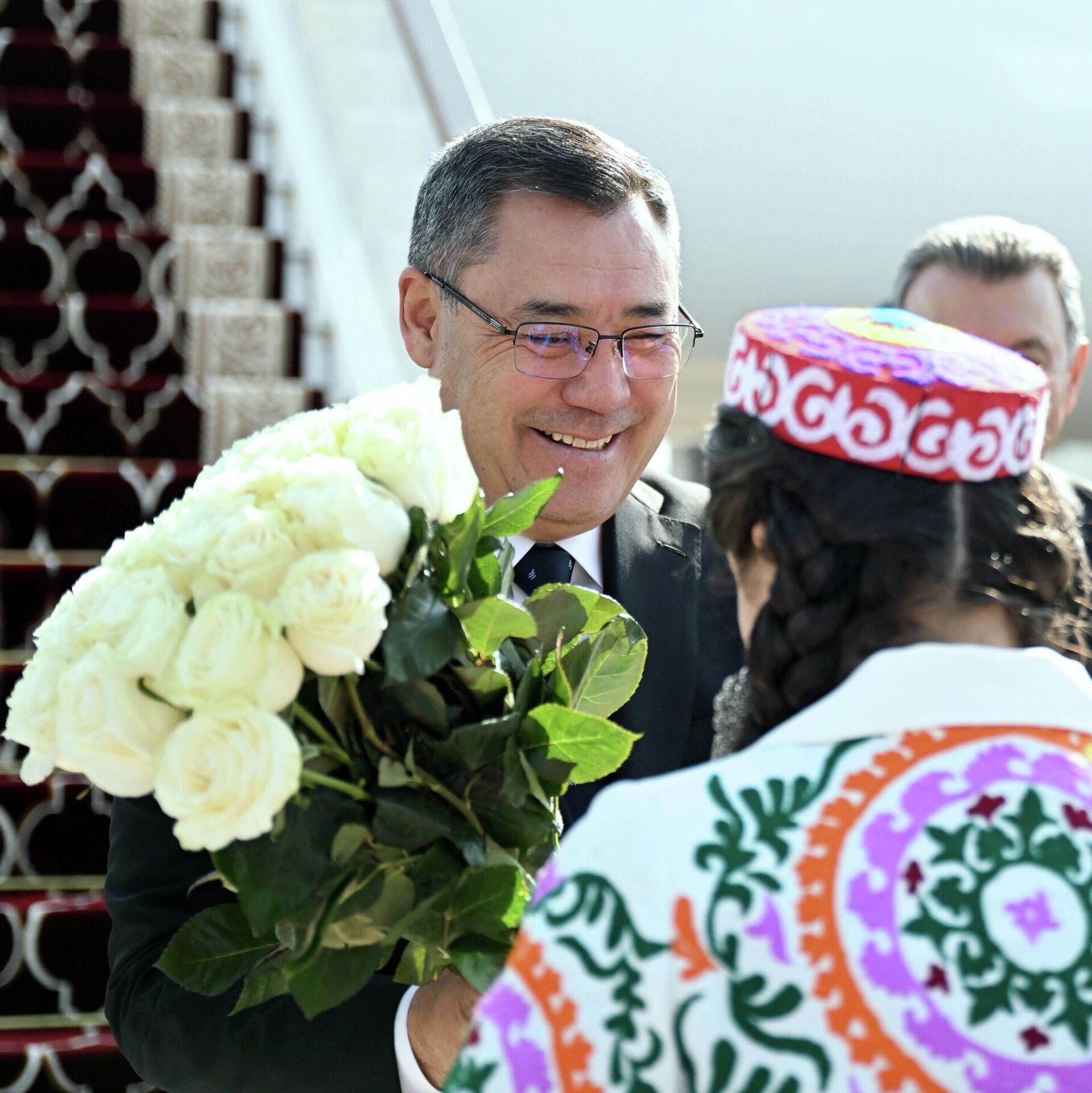 Борт Жапарова приземлился в международном аэропорту Душанбе. Его встретили премьер-министр РТ Кохир Расулзода и другие официальные лица.