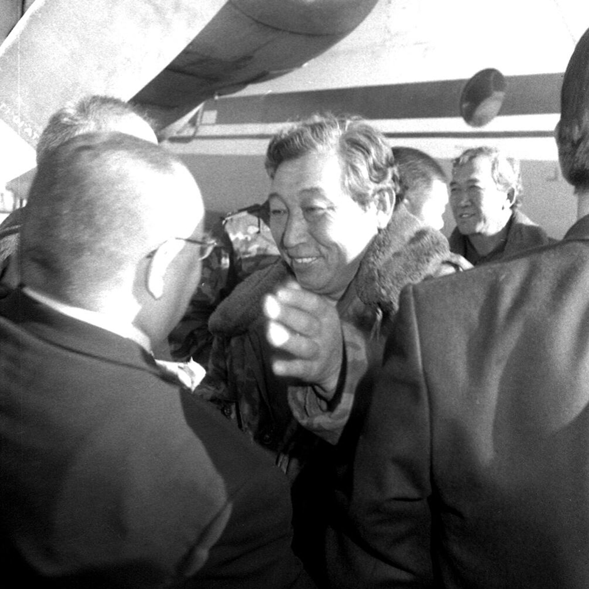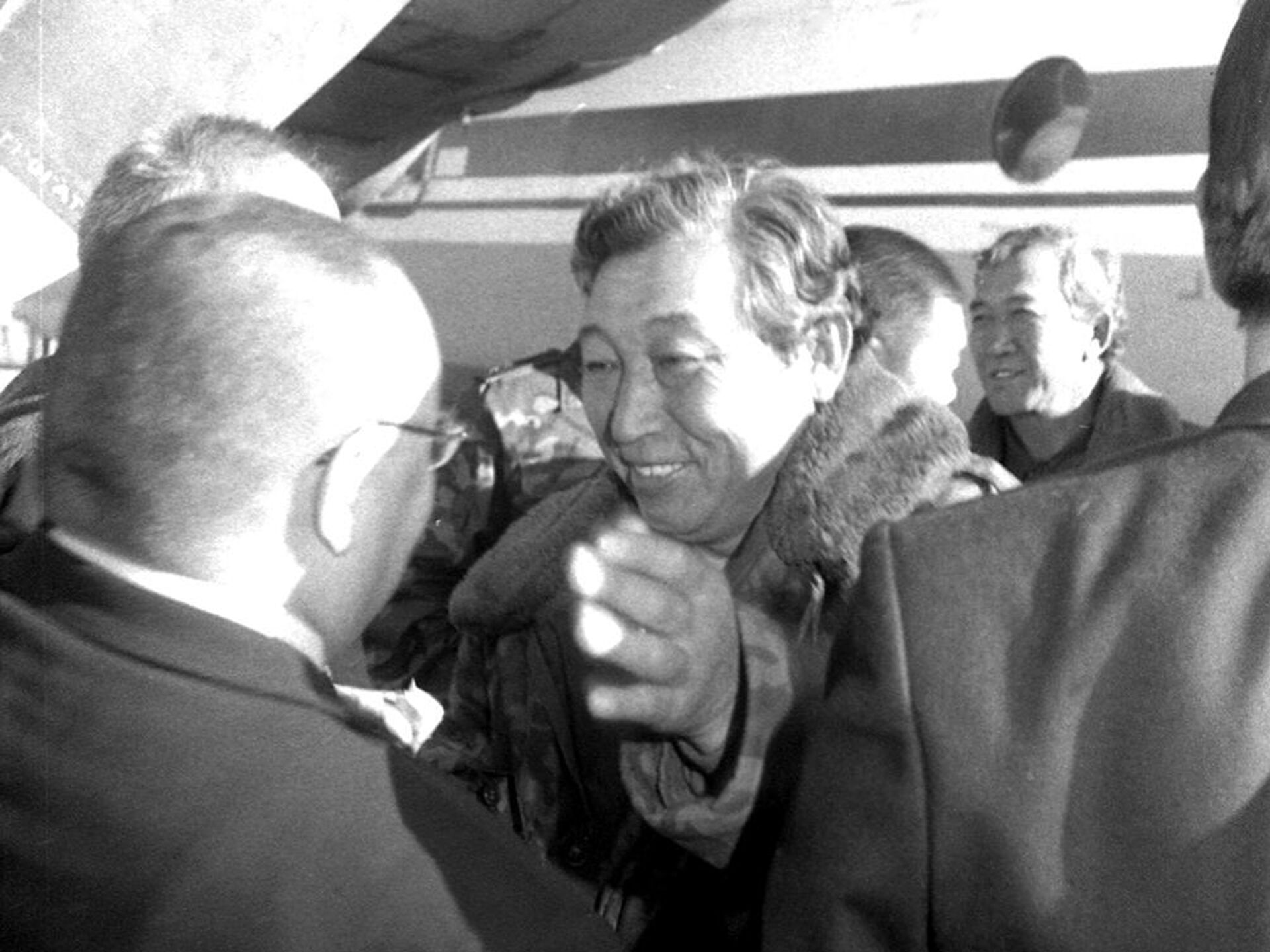 Генерал-майора внутренних войск Анарбека Шамкеева встречают после освобождения из плена запрещенной террористической организации в КР и РФ "Исламского движения Узбекистана"* Кантский военный аэропорт, 1999.