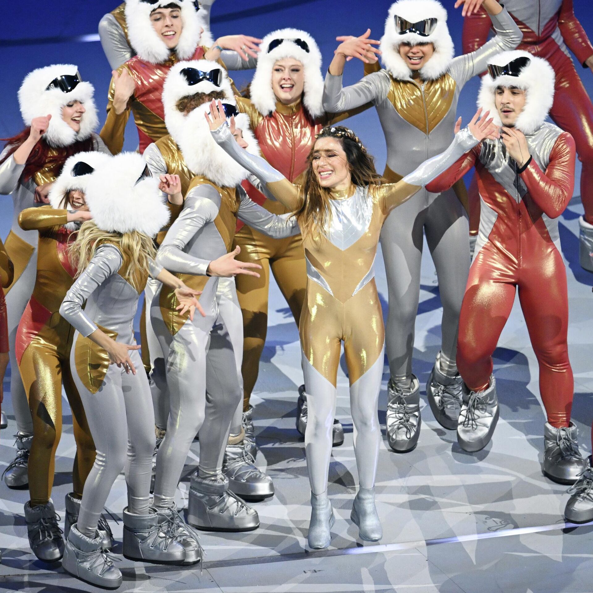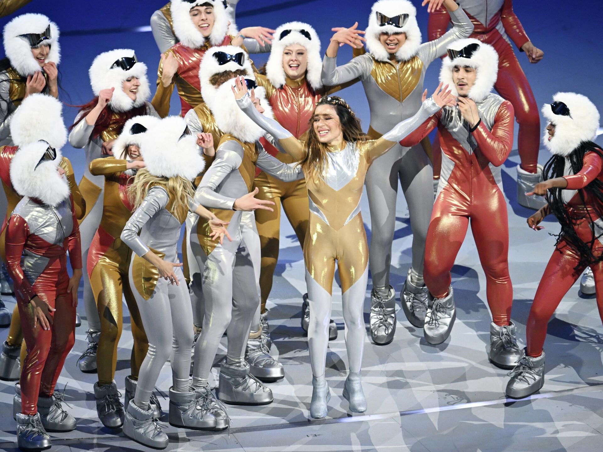 Американская актриса Шарлиз Терон выступает на церемонии открытия XXV зимних Олимпийских игр на стадионе Сан-Сиро в Милане